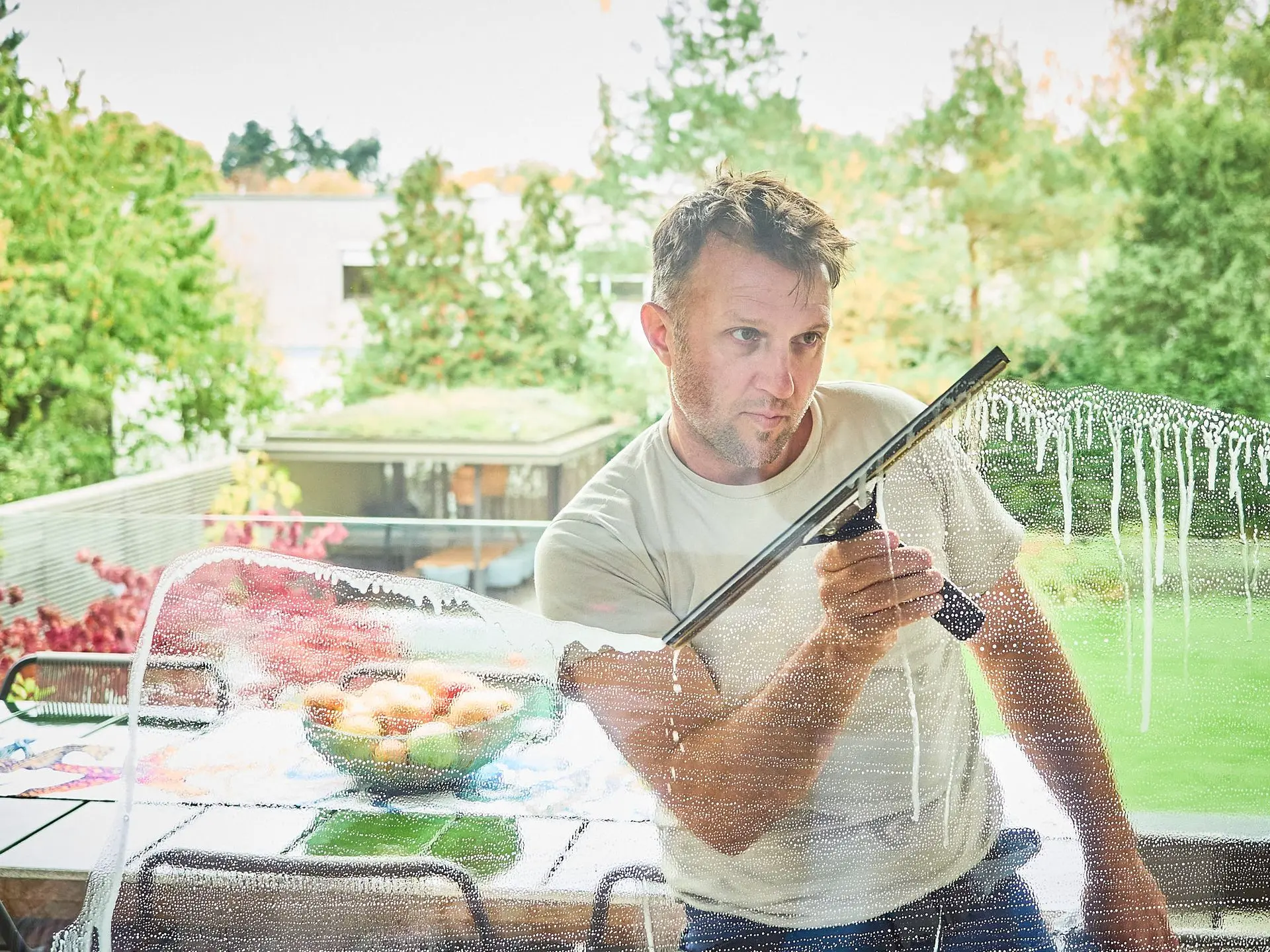 Textured glass: Requires extra scrubbing. Use a stiff brush before squeegeeing.